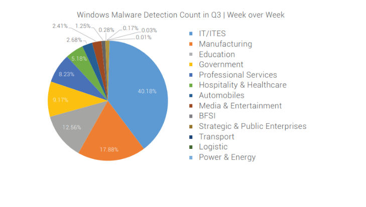 Above is the pie chart of the detection rate that Seqrite detected for the 3rd quarter of 2018, with IT and manufacturing sector occupies the majority target of exposures and cybersecurity threats. In each industry mentioned in the pie graph, there is a list of top malware that are most commonly detected.